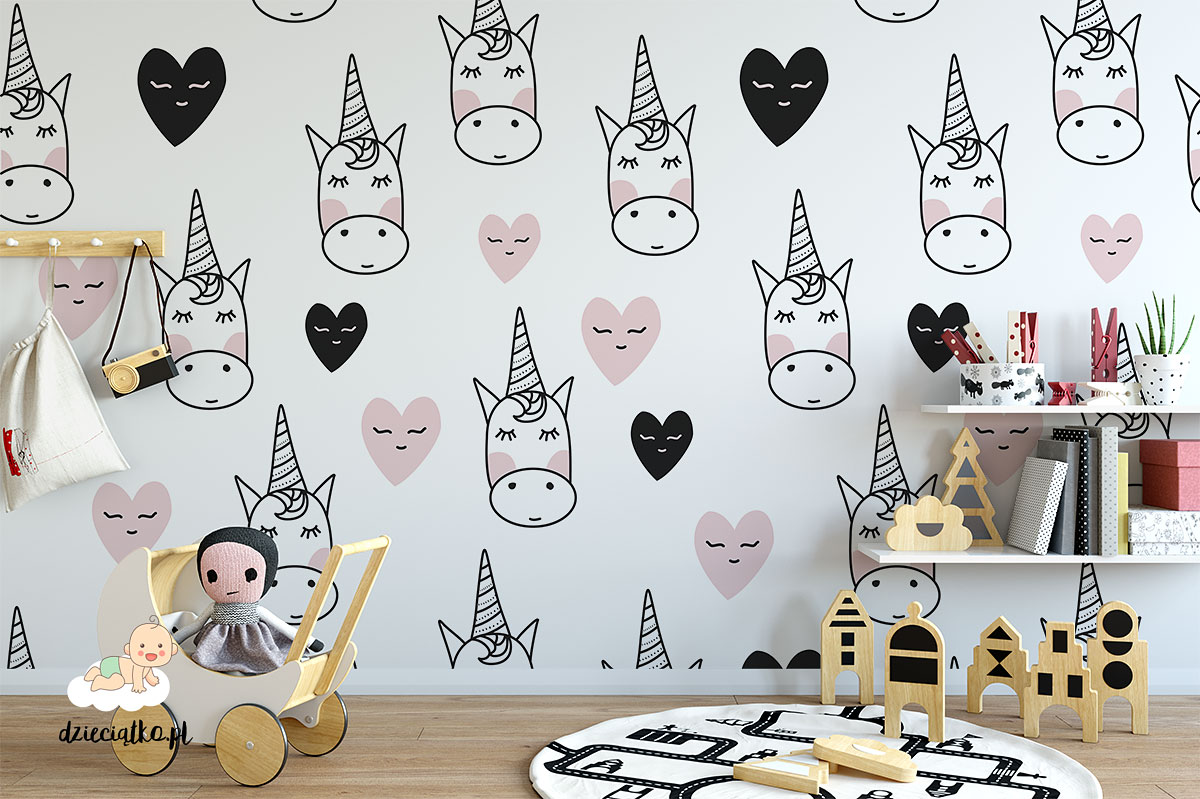 Wysokiej jakości fototapeta z unikatowym wzorem „Kochane Jednorożce”, który znakomicie sprawdzi się w pokoju dziecięcym.