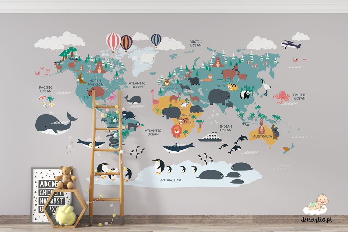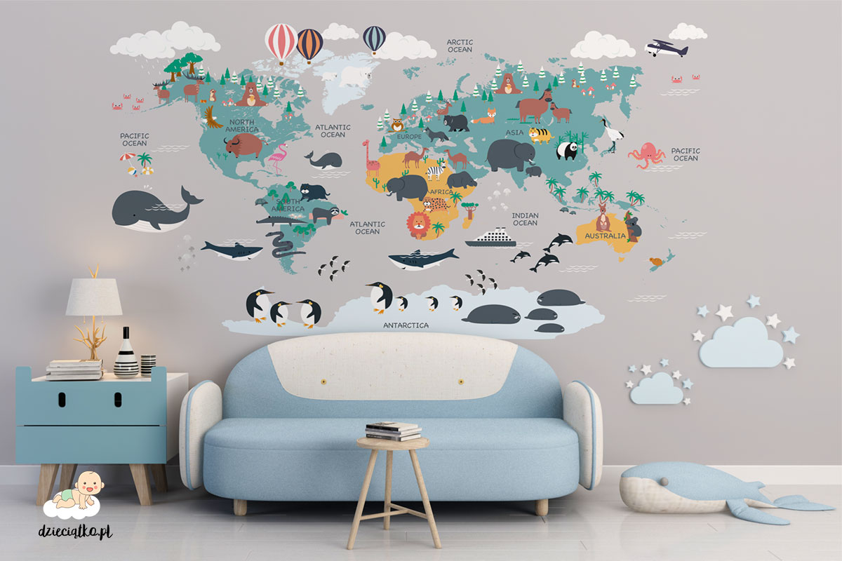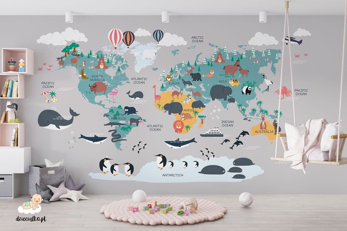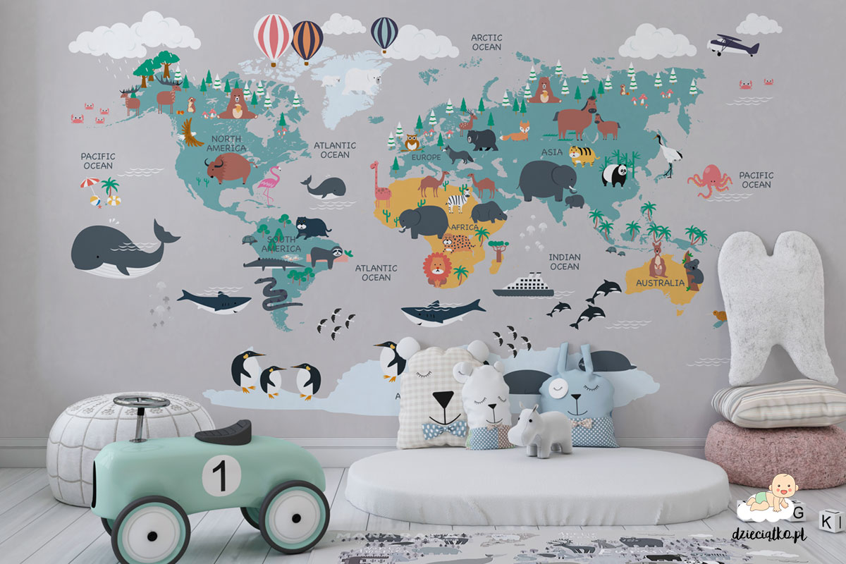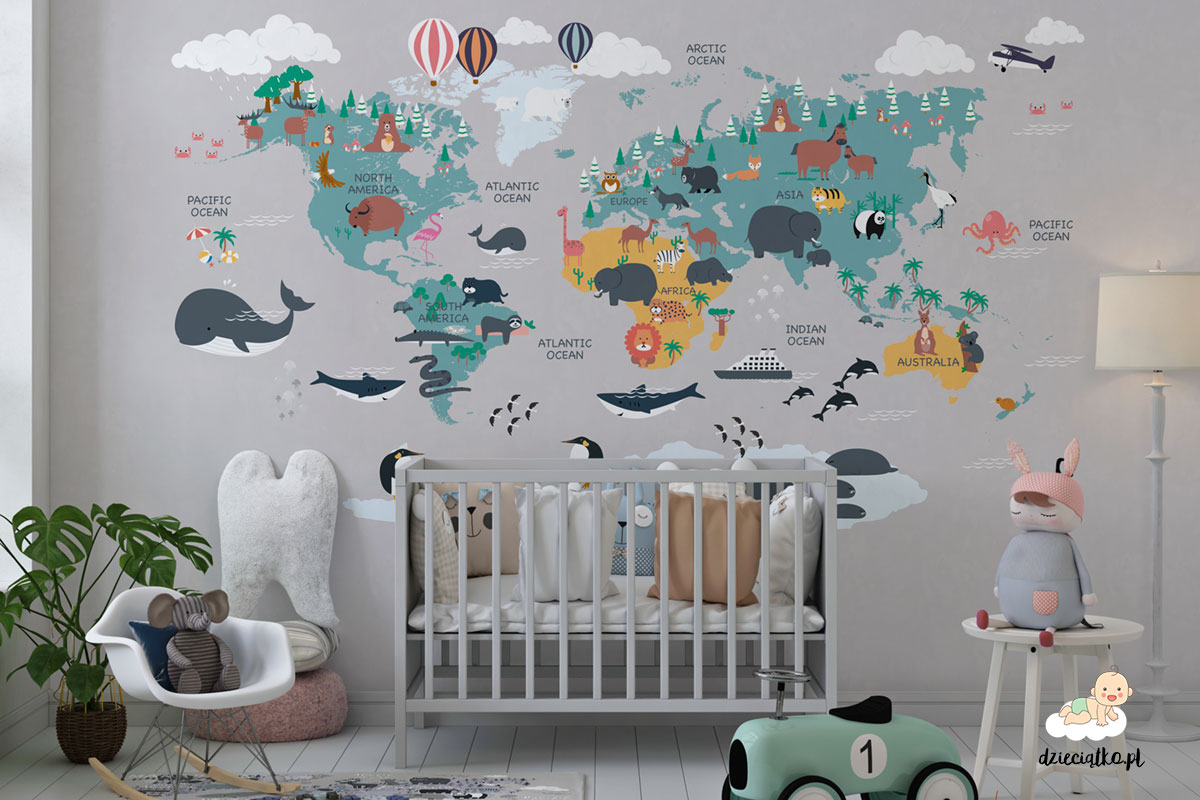 Wysokiej jakości fototapeta z unikatowym wzorem „Kolorowa mapa świata”, który znakomicie sprawdzi się w pokoju dziecięcym.