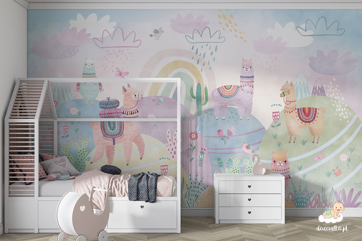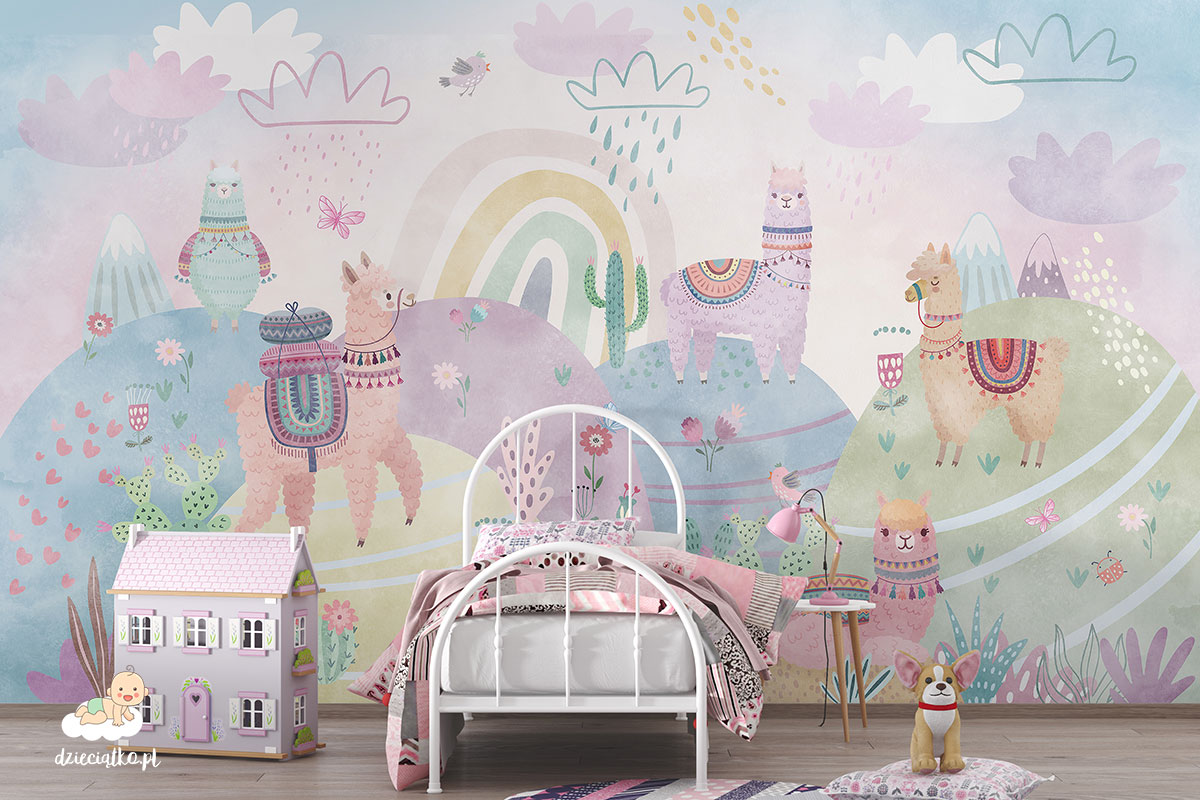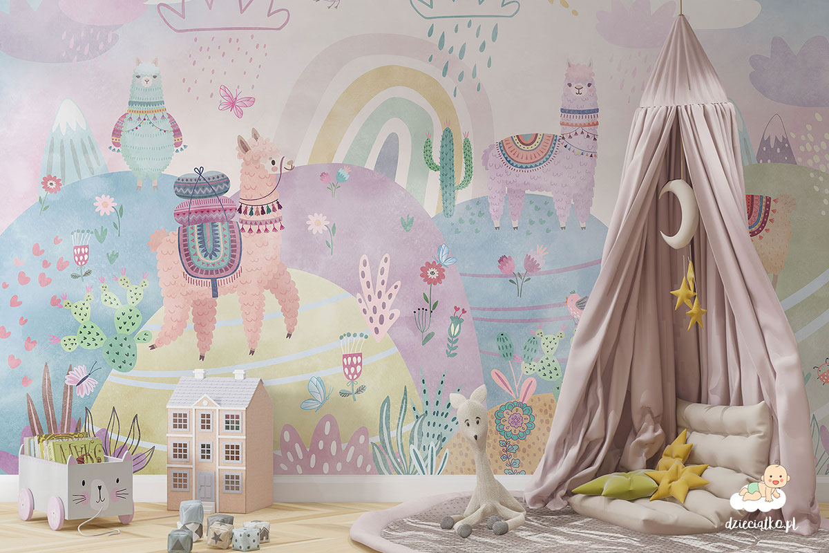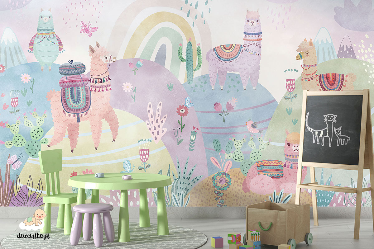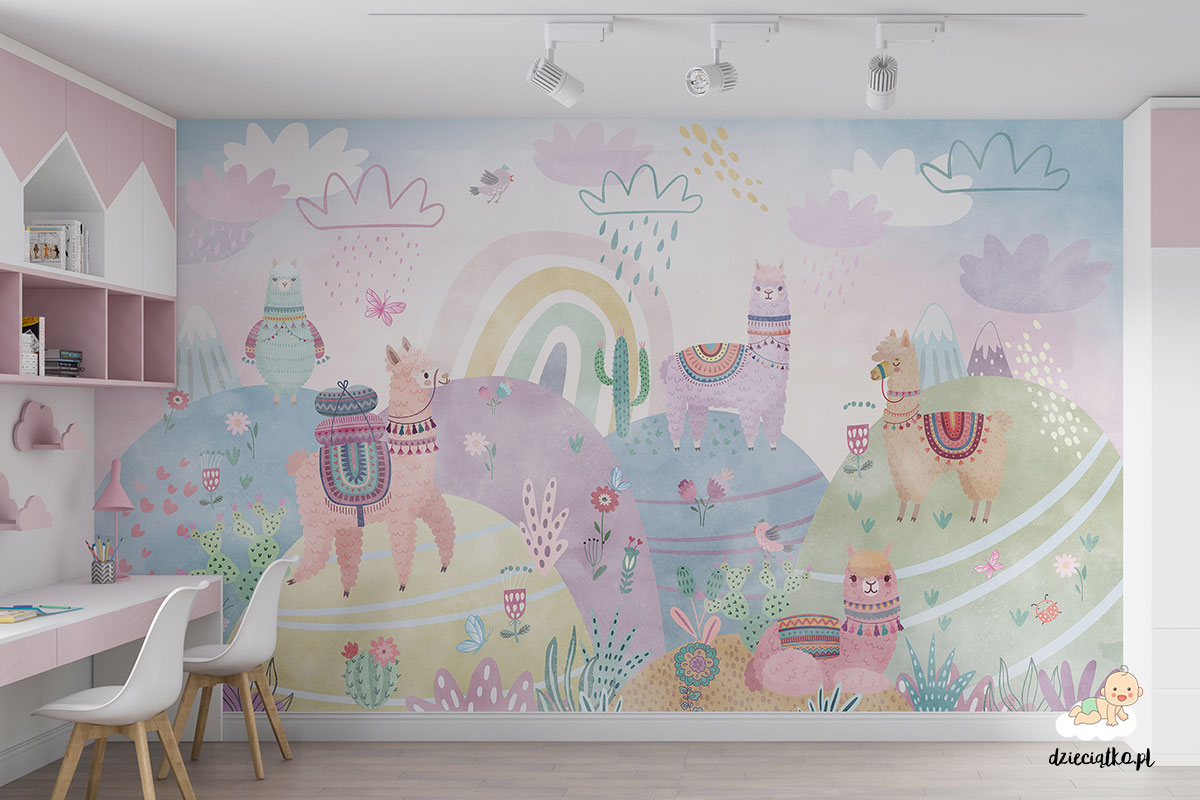 Wysokiej jakości fototapeta z unikatowym wzorem „Pastelowe lamy”, który znakomicie sprawdzi się w pokoju dziecięcym.