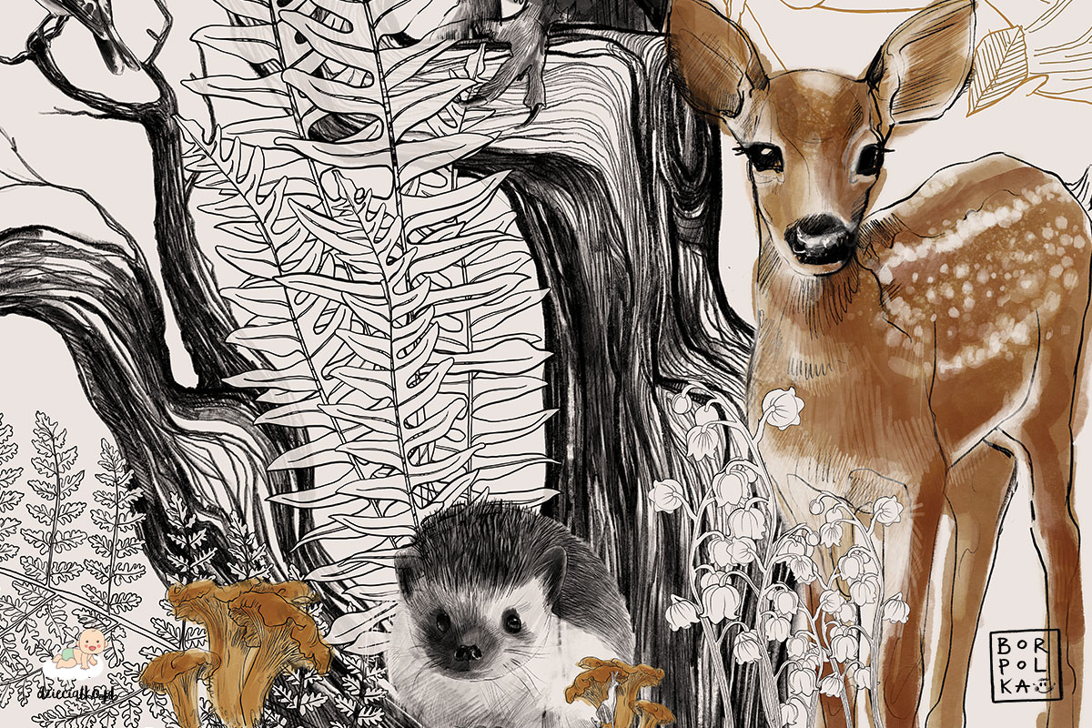 UWAGA! Wszystkie gatunki zwierząt i roślin na ilustracji występują w polskim lesie/sadzie!